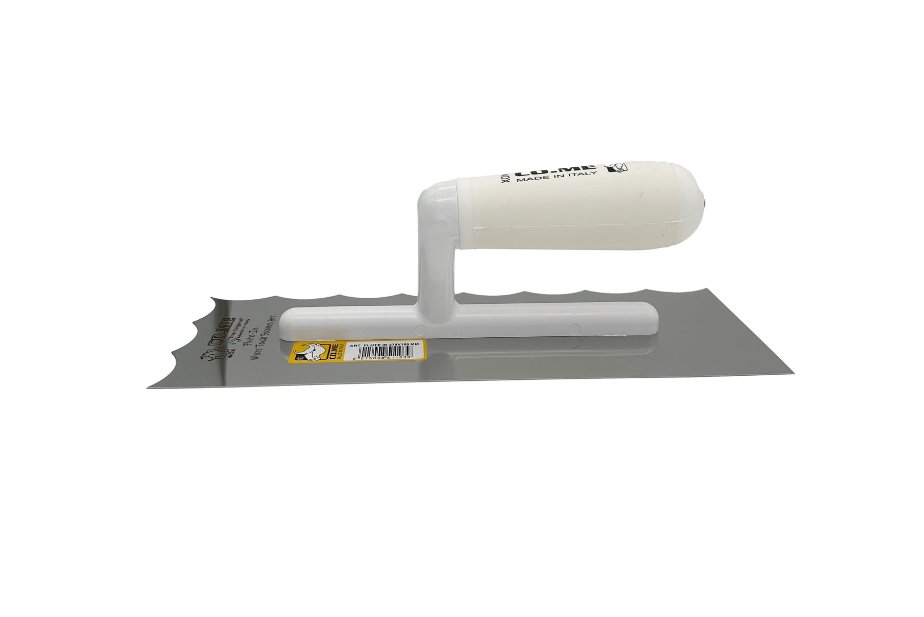 This versatile trowel features a flat blade on one side for smooth application, while the opposite has notches designed to create unique decorative effects. Available in a rubber handle and wooden handle. Made in Italy by Co.Me